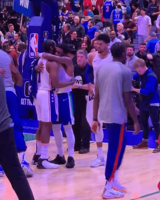 赛后,欧文正在和哈里斯寒暄时,哈登主动走过来,从背后给欧文捏肩,然后欧文扭头,两人拥抱热聊;随后哈登和大莫里斯拥抱,欧文和哈里斯互换球衣;另外东欧组合还和恩比德拥抱并且有说有笑开怀畅聊。