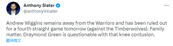 24直播网讯02月26日勇士公布下一场对阵森林狼的伤病报告,维金斯因个人原因继续缺席比赛,库里、伊戈达拉和小佩顿因伤无法出战,格林因膝盖挫伤被列为出战成疑;究竟维金斯怎么了?暂未曝光,由于处理家庭事务,维金斯已经离开球队12天,连续缺席4场比赛。