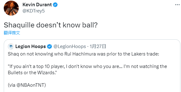 杜兰特为八村垒鸣不平,此前湖人名宿奥尼尔曾在节目中表示如果不是联盟前十的球员,他不会知道那是谁,他不会看奇才队的比赛,还曾直言:我甚至不知道八村垒是谁,向夺冠应该交易来比尔;对此杜兰特发推回应奥尼尔:沙克不懂球吗?