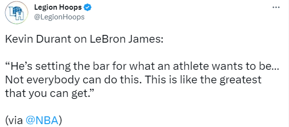 杜兰特表示:詹姆斯为一个运动员想成为什么的人设立了一个标杆。并不是每个人都能够做到这一点。这就像是你所能得到的最棒的东西。特别是在我们这个篮球时代,能够有他这样一个取得如此成就的人是令人鼓舞的。这将在很长一段时间内为篮球运动员开创先例。