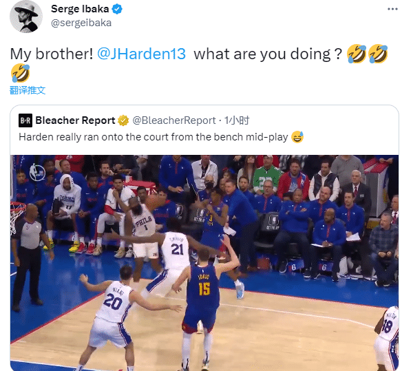 哈登前队友伊巴卡更推转发哈登偷鸡视频,并写道:我的大兄弟@哈登你在干嘛啊?(3个笑哭的表情)。