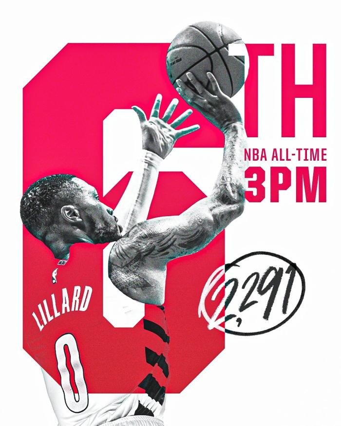 3、利拉德三分命中数超越卡特,升到历史三分榜第6位