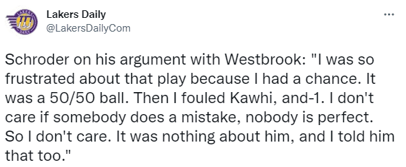 赛后谈及此事,施罗德表示:我对那个回合感到很沮丧,因为我本来是有机会的。这是一个五五开的球。然后我对莱昂纳德犯规了,多送了一分。我不在乎是否有人犯了错,没有人是完美的。所以我不在乎这个。这和威少无关,我也告诉他了。