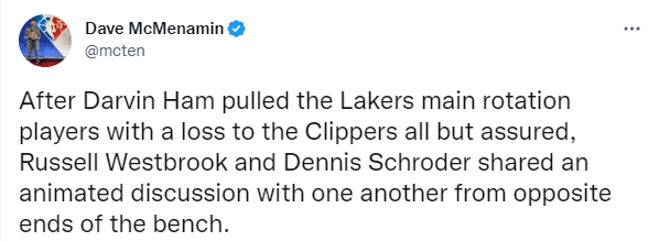 据湖人随队记者Dave McMenamin报道,湖人撤下主力后,第四节威少和施罗德在替补席进行了“激烈的讨论”,当时詹姆斯坐在旁边,一脸沮丧无心搭理他们之间的争论。