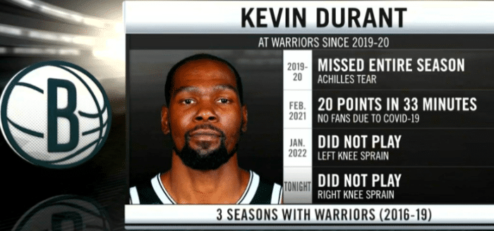 24直播网01月23日讯 NBA常规赛篮网客场大战勇士,杜兰特因伤继续休战,据统计,自从2019年离开勇士后,杜兰特还没有当着勇士球迷的面在勇士主场打过比赛;欧文上半场11投6中拿到16分4助攻3篮板,常规赛总得分突破15000分大关,迎来里程碑,不过半场打完,篮网落后12分。