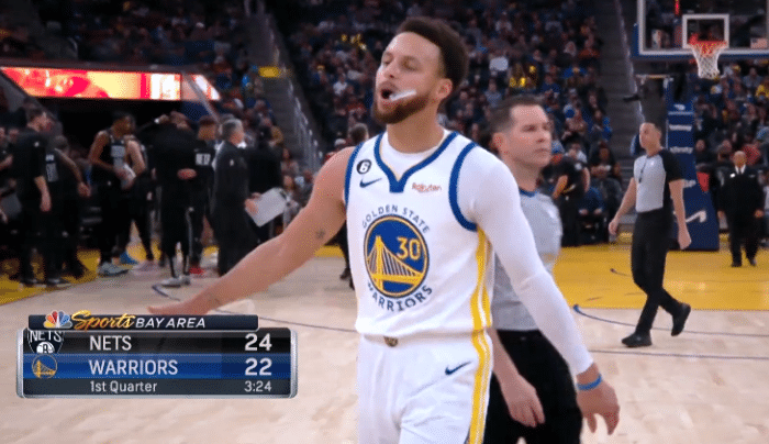 第二节,欧文继续带队,小库里续上三分,欧文急停干拔以及外线再中三分,当篮网落后9分时,欧文仅仅只歇2分多钟就重新上场,勇士使用砍克拉克斯顿战术,砍人战术奏效,勇士不断扩大领先,欧文带队继续反扑,半场打完篮网60-72落后勇士12分。