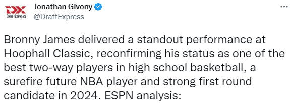 Jonathan Givony还发文分析了布朗尼,他在肯定布朗尼的天赋以及防守实力后,还称赞了布朗尼在外线投射方面的进步;选秀专家表示:尽管由于父亲是詹姆斯,布朗尼获得了难以置信的热度和关注,但他看起来依旧是一位非常出色的队友,他拥有极其优秀的沟通水准,看起来只专注于用正确的方式去打球,并帮助球队取胜。在未来几周发布的2024年NBA模拟选秀中,布朗尼将成为首轮秀的候选人。
