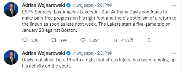 名记woj确认浓眉预计下周复出,湖人将在1月29日对阵凯尔特人,并开启五连客之旅;自从12月17日遭遇右脚应激反应后,浓眉一直在加强他在场上的活动。