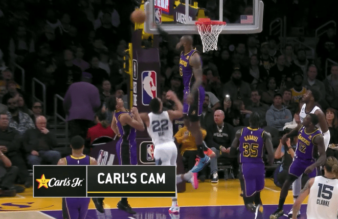 24直播网01月21日讯 ,湖人主场对阵灰熊,詹姆斯又奉献招牌追身钉板大帽,38岁詹皇继续演绎不老神话;第二节10分多钟,贝恩持球突破,詹姆斯黄雀在后,追身钉板大帽贝恩,脑袋险些碰到篮板,老詹这一帽太狠了。