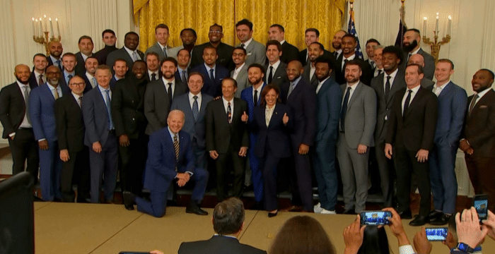 演讲时,拜登调侃科尔的手指快不够用了,因为科尔已经获得9枚总冠军戒指(球员时期5枚和主帅时期4枚);全员合影时,拜登单膝跪地十分抢镜,库里、维金斯、伊戈达拉、汤普森、格林和科尔以及勇士老板拉科布等人都站在前排,普尔和卢尼都戴着眼镜站在后面。