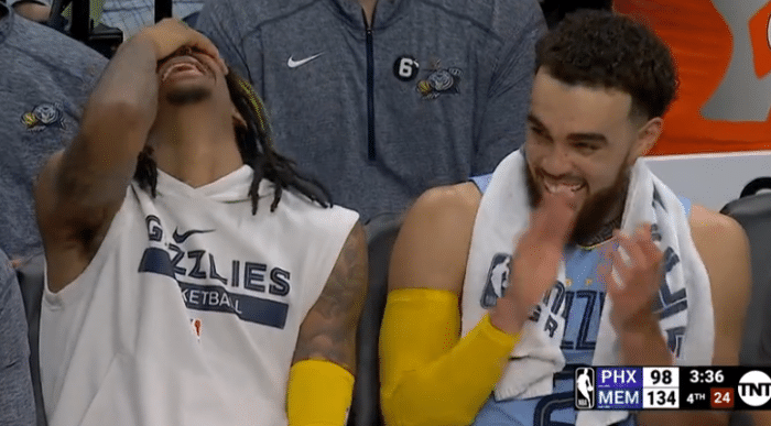 末节灰熊继续扩大分差,莫兰特无需继续上场,三节打卡下班,坐在替补席和队友有说有笑太惬意以及为队友暴扣疯狂庆祝。据统计,灰熊本赛季领先10分以及以上时,他们取得30胜0负的战绩,在这样的情况下保持不败,打爆太阳豪取10连胜太狠。