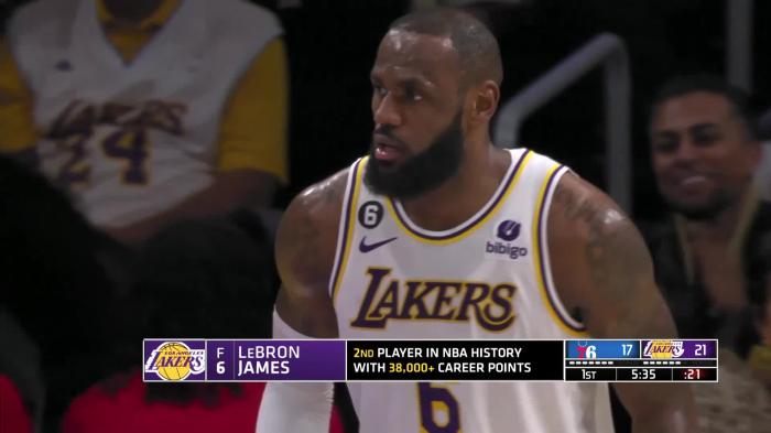 面对费城76人,38岁詹姆斯早早开启进攻模式,状态火热,第一节9投8中高效轰下16分还有3助攻2篮板;第一节5分43秒,威少助攻詹姆斯干拔命中,这是詹姆斯突破38000分的一球,全场球迷为老詹欢呼;对于这样的伟大时刻,詹姆斯一脸平静,抬头看了一眼大屏幕。