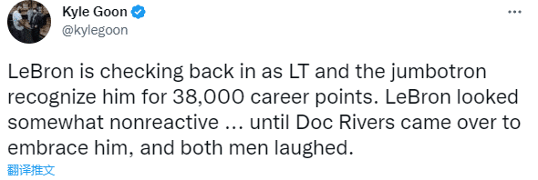 据湖人记者Kyle Goon报道,第一节詹姆斯重新上场时,湖人主场大屏幕播放他38000分一幕,不过詹姆斯当时没什么反应,和里弗斯拥抱后,他们两人都笑了。