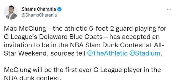 24直播网01月14日讯 ,据名记shams报道,湖人旧将马克-麦克朗已经接受参加NBA扣篮大赛,麦克朗承诺参加扣篮大赛创造历史,成为史上第一位参加扣篮大赛的发展联盟球员;目前扣篮大赛4人名单已确定三席,另外两位参赛者是开拓者新秀夏普和火箭名宿之子小马丁。