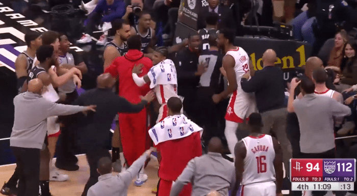 火箭和国王冲突时,泰特、杰伦-格林擅自离开了替补席,可能会被联盟禁赛一场;值得一提的是,小贾巴里-史密斯也试图踏入球场,但及时被尼克斯拉了回去。
