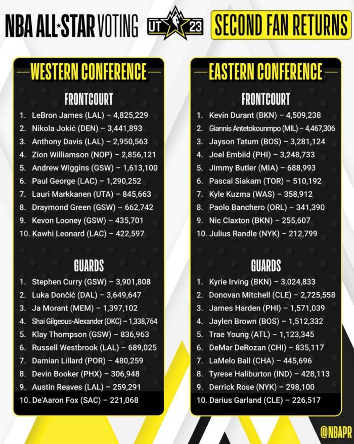 东部前场:杜兰特4509238票、字母哥4467306票、塔图姆3281124票、恩比德3248733票、巴特勒688993票、西亚卡姆510192票、班凯罗341390票、克拉克斯顿255607票和兰德尔212799票