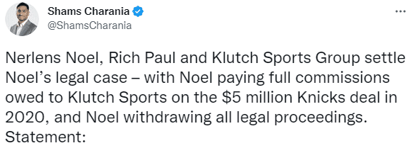 据名记Shams报道,诺埃尔与里奇-保罗、Klutch Sports经纪公司已经就诺埃尔与尼克斯2020-21赛季的合同以及其他相关问题达成和解,和解条款包括诺埃尔支付欠Klutch体育的全部佣金以及撤销所有未决的法律诉讼。
