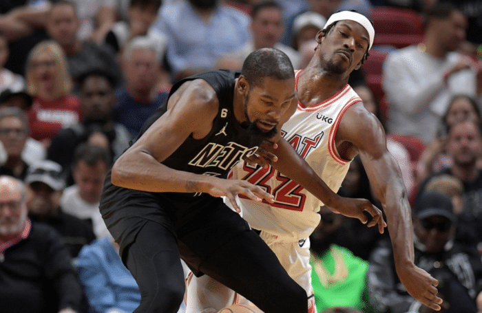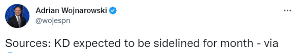 在篮网对阵热火比赛中,第三节杜兰特被倒地的巴特勒误伤,被撞到膝盖后坚持打了一会,然后下场并且返回更衣室接受检查,因伤提前退出比赛;如今杜兰特的伤情确诊,未来2周他都无法出战,名记woj报道,预计杜兰特将会休战一个月。