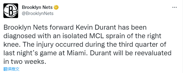 篮网官方宣布,杜兰特的伤情确诊为右膝内侧副韧带扭伤,他将在2周后接受复查。
