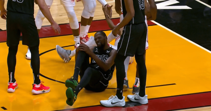 在篮下,杜兰特被倒地的巴特勒不慎撞倒膝盖,杜兰特穿上鞋之后继续比赛,之后杜兰特要求下场,并且返回更衣室接受检查;之后篮网官宣杜兰特因右膝受伤退出本场比赛。