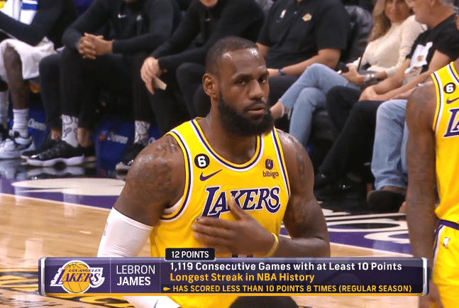詹姆斯继续刷新历史第一纪录,生涯连续1119场得分上双,生涯至今,常规赛仅仅只有8场比赛得分未上双。