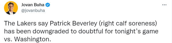 24直播网12月19日讯 ,湖人巨星安东尼-戴维斯因右脚受伤至少休战一个月,而且是无限期休战暂无复出时间表;浓眉伤停后湖人又添伤员,又一主力遭遇伤病,据湖人记者Jovan Buha报道,湖人方面宣布,帕特里克-贝弗利因右小腿酸痛,大概率缺席与奇才的比赛。