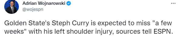 24直播网讯12月16日在勇士输给步行者比赛中,库里不幸遭遇伤病,因左肩受伤提前退出比赛,如今库里的最新伤情曝光,据名记沃纳罗斯基报道,库里将因左肩伤势缺席几周,左肩盂唇受伤至少伤停2周,库里伤停几周是对勇士的一大重击。