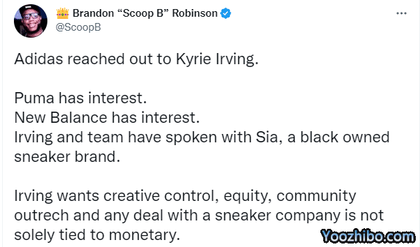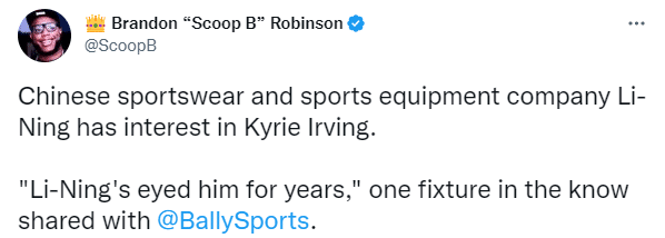 Brandon Robinson报道,中国运动品牌李宁对欧文有兴趣,知情人士透露,多年以来,李宁一直在关注欧文;阿迪达斯已经联系了欧文,彪马、新百伦和一个黑人运动品牌也对欧文有兴趣;在欧文的任何球鞋代言合同中,不仅仅与金钱挂钩,他还想要创作控制权以及股权。