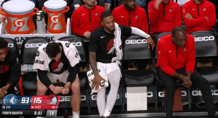 末节利拉德坐在替补席休息,临时治疗大腿伤势,由于开拓者领先优势太大,比赛早早沦为垃圾时间,利拉德不再上场,无缘打破汤普森保持的单场14记三分历史第一纪录。