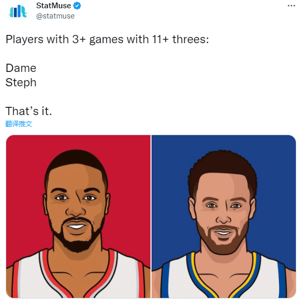 3、利拉德成为NBA历史上第二位至少3次单场至少命中11记三分的球员,库里曾12次做到