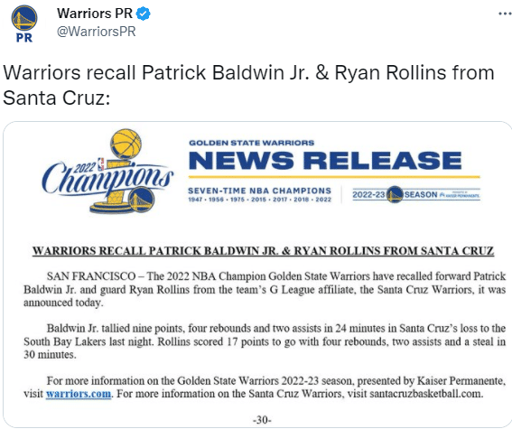 勇士官方宣布,球队从发展联盟附属球队圣克鲁兹勇士队召回鲍德温和罗林斯,榜眼怀斯曼继续留在发展联盟。
