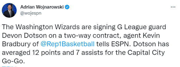 奇才将与后卫德文-多特森签下一份双向合同,为了腾出空间,奇才将裁掉后卫乔丹-舍克尔(双向合同)。