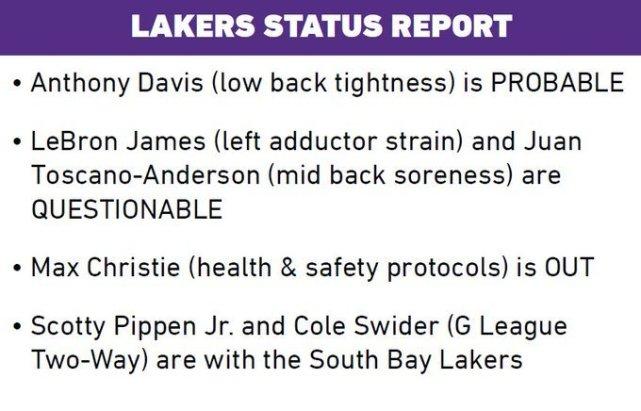 24直播网11月20日,湖人官方公布了最新的伤病报告,詹姆斯(左内收肌拉伤)和托斯卡诺-安德森(背部酸痛)的状态同为出战成疑(questionable,50%上场可能),浓眉(腰部紧张)的状态是大概率出战(probable,75%上场可能)。克里斯蒂触发健康安全协议,继续休战。小皮蓬和斯维德仍在G联赛的南湾湖人效力。