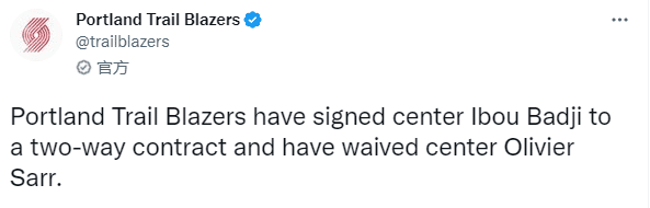 开拓者官方宣布,球队与中锋伊布-巴吉签下一份双向合同,并裁掉了奥利维尔-萨尔。