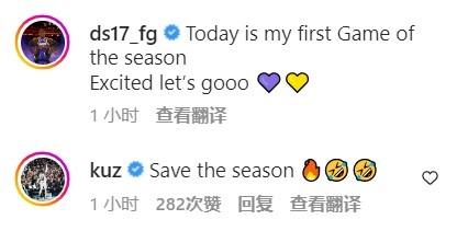 湖人旧将库兹马在下方评论道:去拯救这个赛季吧!(笑哭表情)