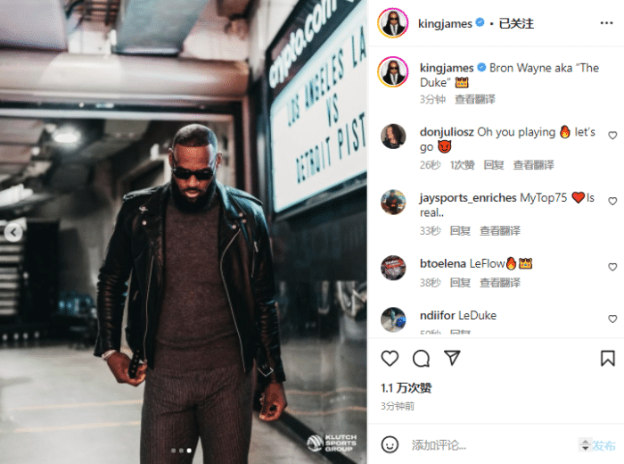 37岁詹姆斯在社交媒体上晒出自己入场的帅照,老詹身穿黑色皮衣、戴着墨镜走进球馆,一副大佬的样子;此前詹姆斯因内收肌拉伤连续缺席了两场比赛,连续休息了8天,现在老詹的出战状态已经升级,有望复出对阵活塞。