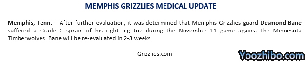 24直播网11月16日,孟菲斯灰熊遭重击,灰熊官方宣布,球队后卫贝恩的伤情经诊断确诊为右大脚趾二级扭伤,他将在2-3周后重新接受评估;换言之,灰熊二当家至少伤停2-3周。