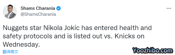 24直播网11月16日,掘金遭遇突发事件,据名记shams报道,约基奇触发联盟的健康与安全协议,将会缺席周四与尼克斯的比赛。