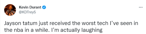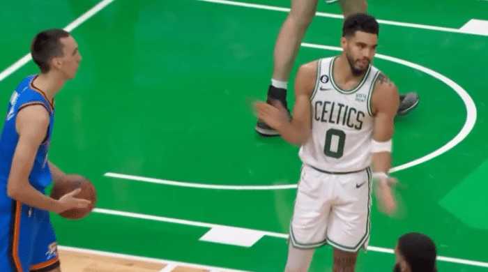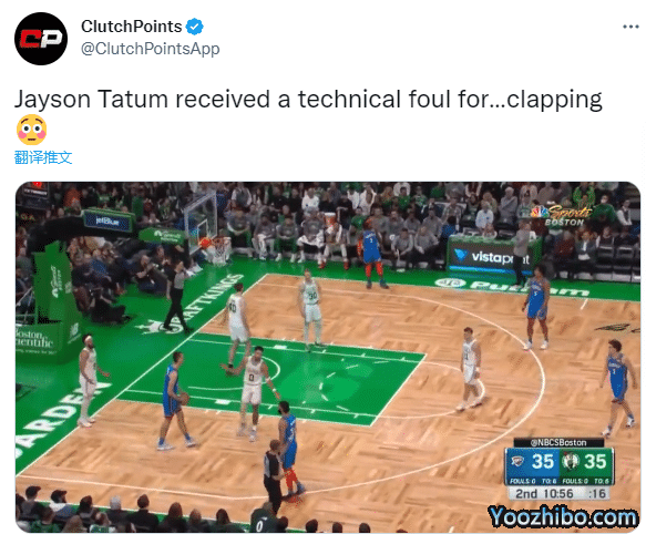 第二节10分56秒,裁判吹罚塔图姆对波库防守犯规,之后塔图姆有些沮丧,并且拍了一下手,裁判追加吹罚塔图姆技术犯规,后者因拍手抱怨吃T,对此塔图姆十分无奈和不解;美媒Clutch Points发推写道:塔图姆因拍手吃到技犯;篮网巨星杜兰特则发推写道:凯文-杜兰特发推:塔特姆吃到了我所见过糟糕的一次技犯,我真的笑了。