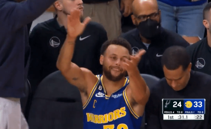 末节,勇士领先马刺40分以上,比赛早早沦为垃圾时间,库里不在上场,坐在场边和别人闲聊以及抠指甲;本场比赛过后,库里场均得分下滑到31.46分,场均得分从联盟第二掉到第六,暂时被恩比德、塔图姆、米切尔和亚历山大反超。