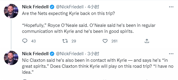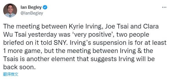 据SNY的篮网记者Ian Begley报道,两位知情人士透露,欧文和蔡崇信夫妇昨天的会面“非常积极”。欧文的禁赛还有一场,但其和蔡崇信夫妇的会面是另一个表明他很快将回归的因素。