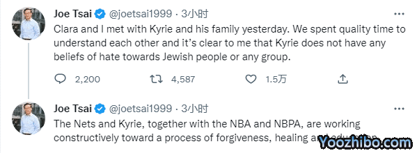 蔡崇信发推写道:Clara(蔡崇信妻子)和我昨天同凯里以及他的家人进行了会面。我们花了大量的时间来了解彼此。很明显,凯里对犹太人或任何群体都没有任何仇恨信仰。篮网和凯里,以及NBA、球员工会,正在朝着一个建设性的宽恕、康复和教育进程而努力。