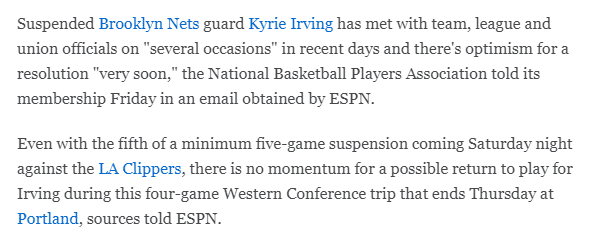 ESPN名记沃纳罗斯基透露,,凯里-欧文最近几天和篮网、NBA以及球员工会进行了数次会面,预计很快就能找到令所有各方都满意的解决方案;不过在篮网结束4连客之前,他基本没有可能重返赛场。