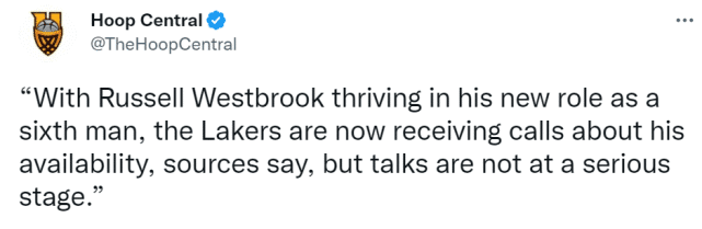 另外,海耶斯报道称,威少在第六人的新角色中表现出色,这也让湖人接到了关于他的询价电话,询问威少能否被交易,不过谈判还没进入到严肃的阶段。