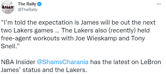 除了更新詹姆斯的伤情之外,shams还报道湖人试训托尼-斯内尔和乔-维斯坎普。