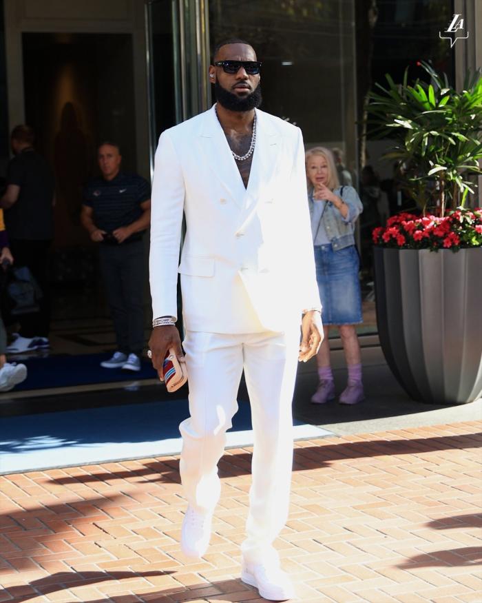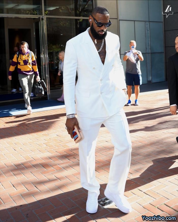 詹姆斯正式开启生涯第20个赛季,身穿一套白色西装、穿着一双白色板鞋并且戴着墨镜前往球馆,詹姆斯上身仅仅穿了一件白色西装,里面没有穿内衬;詹姆斯还戴着大粗金链子,手腕上也戴着金链子,37岁老詹这造型太帅气了。