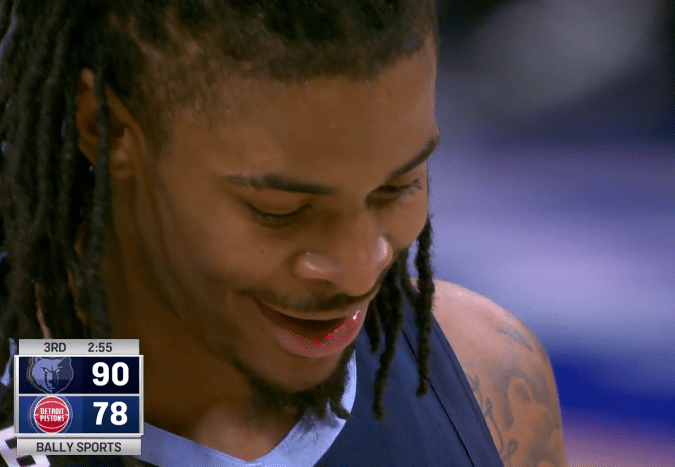 末节,莫兰特不再上场,三节打卡下班,坐在场边观战。