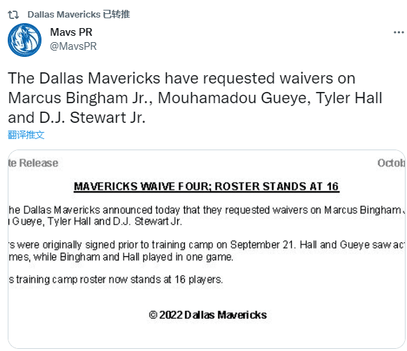 独行侠官方宣布连续裁掉4名临时工,球队已经裁掉了小马库斯-宾厄姆、穆哈马杜-盖耶、泰勒-霍尔和小DJ-斯图尔特,他们都是和独行侠签下训练营合同,被裁后再次失业。