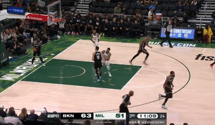下半场,杜兰特抢断字母哥,篮网反击得分,随后西蒙斯击地助攻队友,助攻杜兰特空位中投,本西拿到本场第10次助攻,字母哥打急了,强打西蒙斯后暴扣泄愤,冲撞并且推开西蒙斯打出火药味;字母哥发力防守杜兰特,两大巨星纷纷倒地。