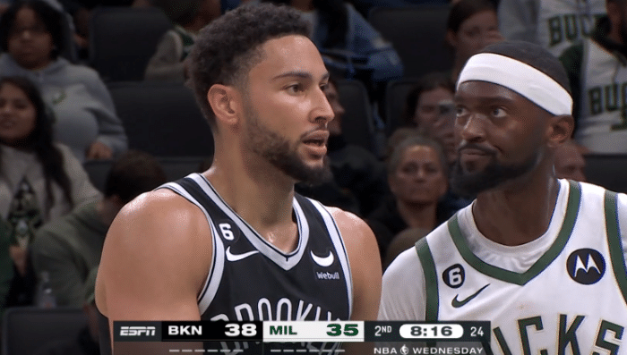 第二节,西蒙斯再次单防字母哥,本西再次让字母哥吃瘪并且让后者出现失误,随后西蒙斯助攻夏普面对字母哥打成2+1,西蒙斯背运突破造犯规两罚不中,2分53秒西蒙斯造犯规两罚一中,终于命中篮网生涯第一个罚球;次节杜兰特3投0中突然哑火,欧文挺身而出,奥尼尔轰进超远压哨三分。